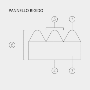 ① Spessore finitura: 10 mm ② Tessuto: 0,5 mm ③ Pannello MDF/ Pannello multistrato: 15 mm SUPPORTO RIGIDO ③ Pannello MDF/ Pannello multistrato: 5 mm SUPPORTO FLESSIBILE ④ Bilanciante: 0,6 mm ⑤ Passo delle fresature: 15 mm ⑥ Spessore finito: 25 mm PANNELLO RIGIDO Spessore finito: 15 mm PANNELLO FLESSIBILE Dimensioni pannello rigido: 3000×1200 mm Dimensioni pannello flessibile: 1200×1800 mm / 3000X1200 mm