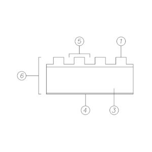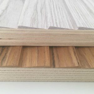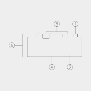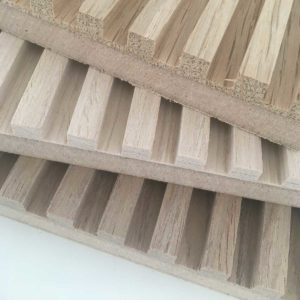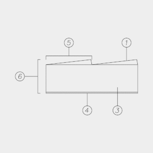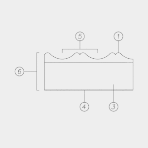 ①  Spessore finitura: 6 mm  Pannello MDF/ Pannello multistrato: 15 mm SUPPORTO RIGIDO ④  Bilanciante: 0,6 mm ⑤  Passo delle fresature: 4|6|8|12 mm ⑥  Spessore finito: 22 mm  Dimensioni pannello rigido: 3000×1200 mm